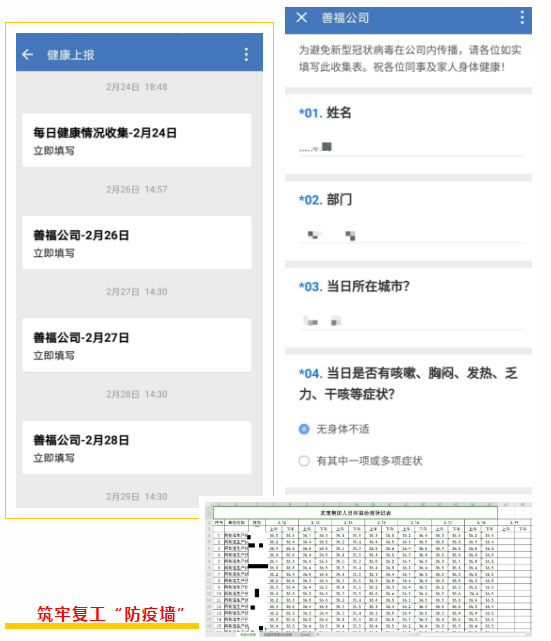 “復工任務雖急,人員安全更重,必須把好人員進場第一關?!痹谌藛T進場管控上,武重集團建立了這樣一條“硬核規(guī)定”:員工必須每天通過企業(yè)微信提交體溫信息,建立員工健康檔案,筑牢復工“防疫墻”。
