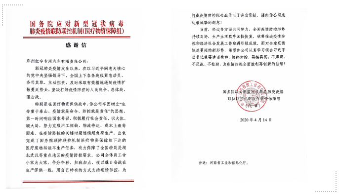 豫西集團鄭州紅宇專汽公司收到國務(wù)院應(yīng)對新型冠狀病毒肺炎疫情聯(lián)防聯(lián)控機制醫(yī)療物資保障組發(fā)來的感謝信