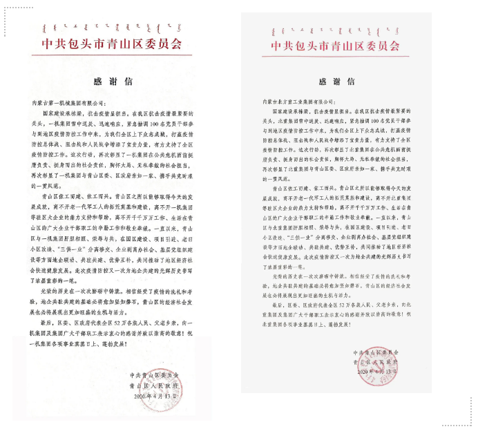 一機集團和北重集團收到中共包頭市青山區(qū)委員會、青山區(qū)人民政府發(fā)來的感謝信和慰問信