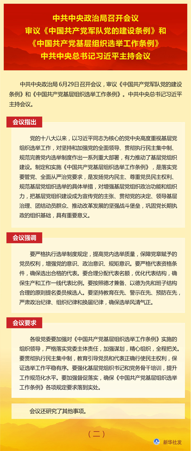 新華社北京6月29日電  中共中央政治局6月29日召開(kāi)會(huì)議,審議《中國(guó)共產(chǎn)黨軍隊(duì)黨的建設(shè)條例》和《中國(guó)共產(chǎn)黨基層組織選舉工作條例》。中共中央總書記習(xí)近平主持會(huì)議。