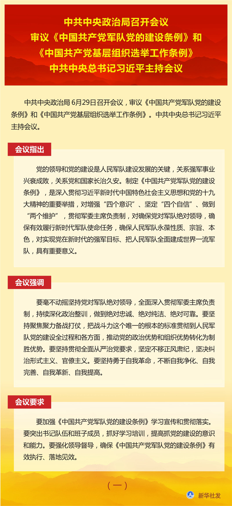 審議《中國(guó)共產(chǎn)黨軍隊(duì)黨的建設(shè)條例》和《中國(guó)共產(chǎn)黨基層組織選舉工作條例》 習(xí)近平主持會(huì)議