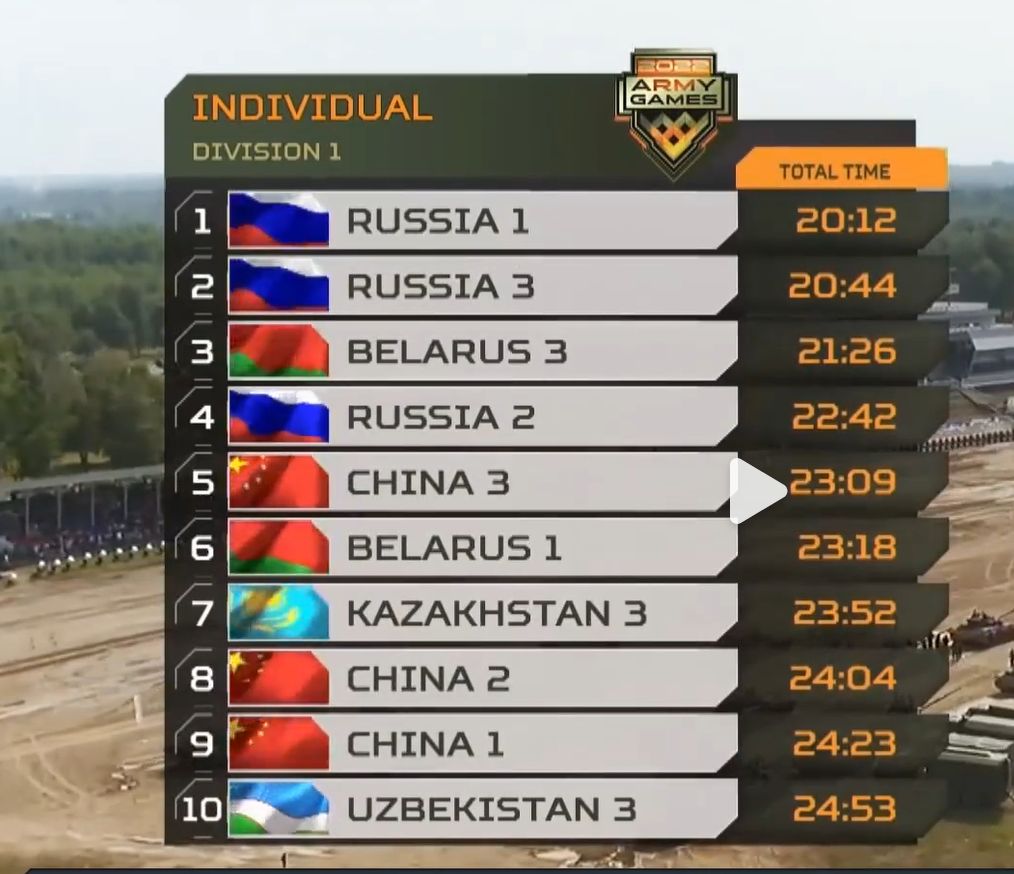比賽正式開始后,中國和俄羅斯參賽隊(duì)率先發(fā)車,白俄羅斯和伊朗參賽隊(duì)分在第二組出發(fā)。最終,中國隊(duì)配合默契,發(fā)揮穩(wěn)定,用時(shí)1小時(shí)06分30秒99贏得比賽,白俄羅斯、俄羅斯分列第二、三名。