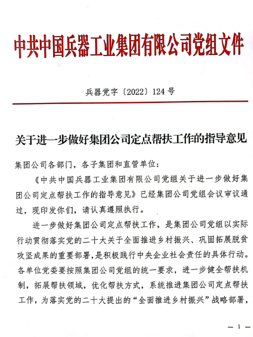 2022年,根據(jù)《中共中央 國務(wù)院關(guān)于實現(xiàn)鞏固拓展脫貧攻堅成果同鄉(xiāng)村振興有效銜接的意見》《關(guān)于堅持做好中央單位定點幫扶工作的意見》等規(guī)定,兵器工業(yè)集團黨組制訂印發(fā)《關(guān)于進一步做好集團公司定點幫扶工作的指導(dǎo)意見》,形成“1+8+5”兵器特色定點幫扶工作體系?!?”,即圍繞“助力全面推進鄉(xiāng)村振興、建設(shè)宜居宜業(yè)和美鄉(xiāng)村”定點幫扶要求,“8”,即“加強系統(tǒng)策劃、完善幫扶長效機制,發(fā)揮比較優(yōu)勢、助力鄉(xiāng)村產(chǎn)業(yè)振興,增強內(nèi)生動力、助力鄉(xiāng)村人才振興,培育文明新風(fēng)、助力鄉(xiāng)村文化振興,踐行‘兩山’理論、助力鄉(xiāng)村生態(tài)振興,加強基層黨建、助力鄉(xiāng)村組織振興,鞏固脫貧成果、加大消費幫扶力度,選派掛職干部、立足鄉(xiāng)村建功立業(yè)”等八項重點任務(wù),“5”,即加強組織領(lǐng)導(dǎo)、落實幫扶資金、做好宣傳引導(dǎo)、增進工作交流、強化考核評價等五方面工作保障。