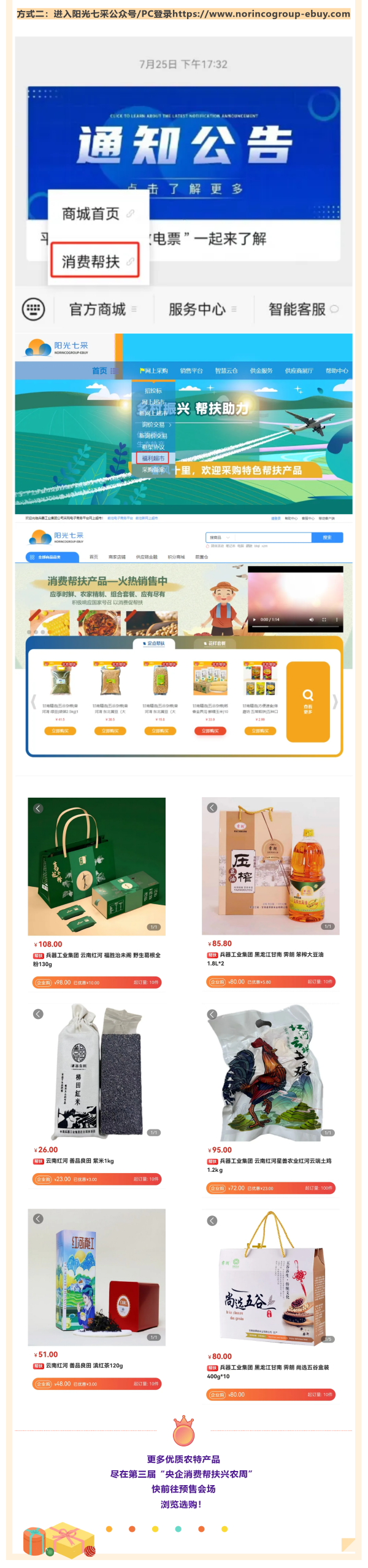 百家央企聚合力 消費幫扶促振興 第三屆“央企消費幫扶興農(nóng)周” 預(yù)售已啟動 8月30日 興農(nóng)周活動將正式開啟 “央企消費幫扶興農(nóng)周”由國務(wù)院國資委社會責(zé)任局指導(dǎo),央企消費幫扶電商平臺(國網(wǎng)數(shù)字科技控股有限公司)主辦,國務(wù)院國資委機(jī)關(guān)服務(wù)管理局、國務(wù)院國資委新聞中心、國網(wǎng)北京市電力公司、各中央企業(yè)電商平臺聯(lián)合協(xié)辦。 活動以“央企攜手,興農(nóng)惠民”為主題,組織動員中央企業(yè)所屬各單位各部門(特別是工會、食堂)、廣大干部職工、上下游供應(yīng)商和業(yè)務(wù)合作伙伴采購幫扶縣的優(yōu)質(zhì)農(nóng)產(chǎn)品,促進(jìn)脫貧地區(qū)產(chǎn)業(yè)發(fā)展和脫貧群眾穩(wěn)定增收,鞏固拓展脫貧攻堅成果。 預(yù)售活動火熱開啟 為方便大家提前選購 此次預(yù)售期升級為10天 (8月20日-8月29日) 誠邀下單 兵器工業(yè)集團(tuán)定點幫扶 黑龍江甘南縣、云南紅河縣 農(nóng)特產(chǎn)品! 8月30日-9月5日 請鎖定“央企館-兵器工業(yè)集團(tuán)” 我們一起共譜鄉(xiāng)村振興新篇章! |