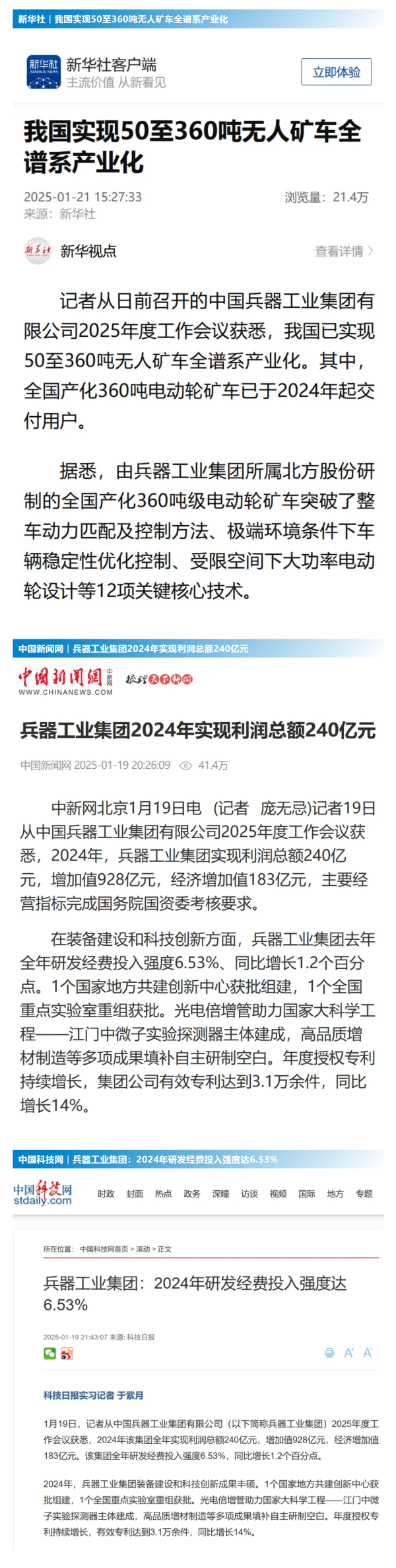 1月19日至20日,中國(guó)兵器工業(yè)集團(tuán)有限公司2025年度工作會(huì)議在京召開,會(huì)議總結(jié)2024年工作,分析形勢(shì)任務(wù),明確工作思路,部署2025年工作。 集團(tuán)公司2024年取得的成績(jī)及下一步重點(diǎn)工作受到社會(huì)媒體廣泛關(guān)注。新華社、中國(guó)新聞網(wǎng)、中國(guó)科技網(wǎng)、光明日?qǐng)?bào)客戶端、經(jīng)濟(jì)日?qǐng)?bào)客戶端、中國(guó)日?qǐng)?bào)網(wǎng)、國(guó)務(wù)院國(guó)資委網(wǎng)站、學(xué)習(xí)強(qiáng)國(guó)中央企業(yè)學(xué)習(xí)平臺(tái)、新浪網(wǎng)、網(wǎng)易網(wǎng)、搜狐網(wǎng)、騰訊網(wǎng)、鳳凰網(wǎng)等中央主流媒體、國(guó)家部委網(wǎng)站及知名網(wǎng)絡(luò)媒體對(duì)集團(tuán)公司2025年度工作會(huì)議進(jìn)行了報(bào)道,重點(diǎn)關(guān)注集團(tuán)公司經(jīng)營(yíng)業(yè)績(jī)、科技創(chuàng)新、產(chǎn)業(yè)結(jié)構(gòu)布局優(yōu)化等情況。其中,新華社以《我國(guó)實(shí)現(xiàn)50至360噸無(wú)人礦車全譜系產(chǎn)業(yè)化》為題,重點(diǎn)報(bào)道了集團(tuán)公司在推動(dòng)智能制造水平提升方面取得的成效;中國(guó)新聞網(wǎng)、光明日?qǐng)?bào)客戶端、經(jīng)濟(jì)日?qǐng)?bào)客戶端、中國(guó)日?qǐng)?bào)網(wǎng)等就集團(tuán)公司2024年度經(jīng)營(yíng)業(yè)績(jī)及各項(xiàng)工作取得的成果進(jìn)行報(bào)道;中國(guó)科技網(wǎng)著重報(bào)道了集團(tuán)公司在科技創(chuàng)新和優(yōu)化產(chǎn)業(yè)結(jié)構(gòu)布局方面的最新進(jìn)展。集團(tuán)公司門戶網(wǎng)站、微信公眾號(hào)、微博等新媒體平臺(tái)以及《中國(guó)兵工報(bào)》也對(duì)集團(tuán)公司工作會(huì)議進(jìn)行了及時(shí)報(bào)道,各成員單位紛紛對(duì)相關(guān)內(nèi)容進(jìn)行轉(zhuǎn)載,引發(fā)全系統(tǒng)關(guān)注。 集團(tuán)公司職工及廣大網(wǎng)友熱議工作會(huì) “2025年工作會(huì)為我們指明了發(fā)展方向、明確了奮斗目標(biāo),面對(duì)全新的機(jī)遇和挑戰(zhàn),作為兵工人深感責(zé)任重大。” “科技是第一生產(chǎn)力,一定要以科技創(chuàng)新引領(lǐng)新質(zhì)生產(chǎn)力發(fā)展,為高質(zhì)量發(fā)展提供支撐?!?/p> “把各項(xiàng)工作做深、做實(shí)、做細(xì),努力為集團(tuán)公司高質(zhì)量發(fā)展添磚加瓦?!?/p> “2024年中國(guó)兵器展示了大國(guó)重器,祝新的一年中再創(chuàng)輝煌!” |